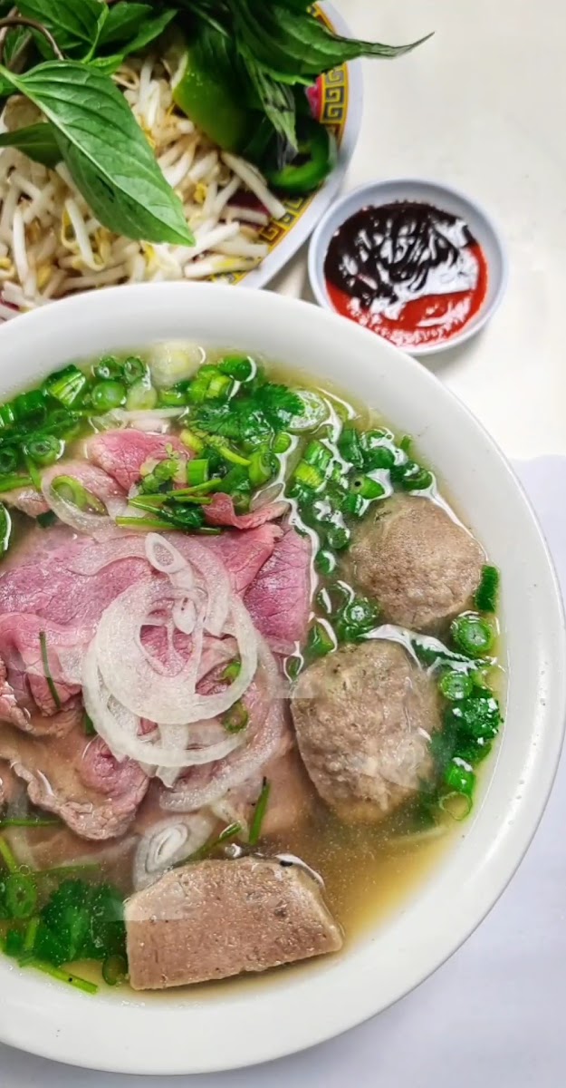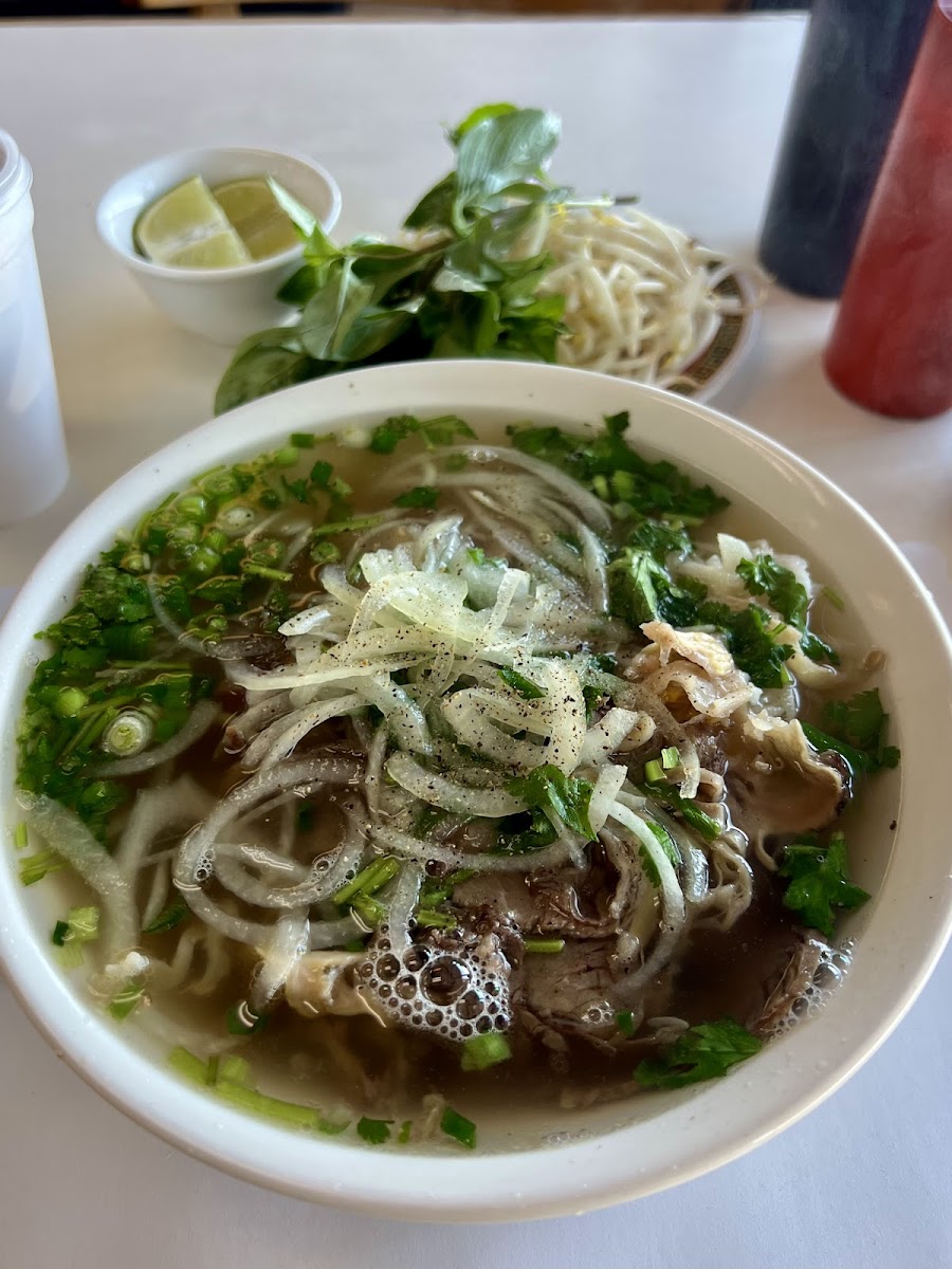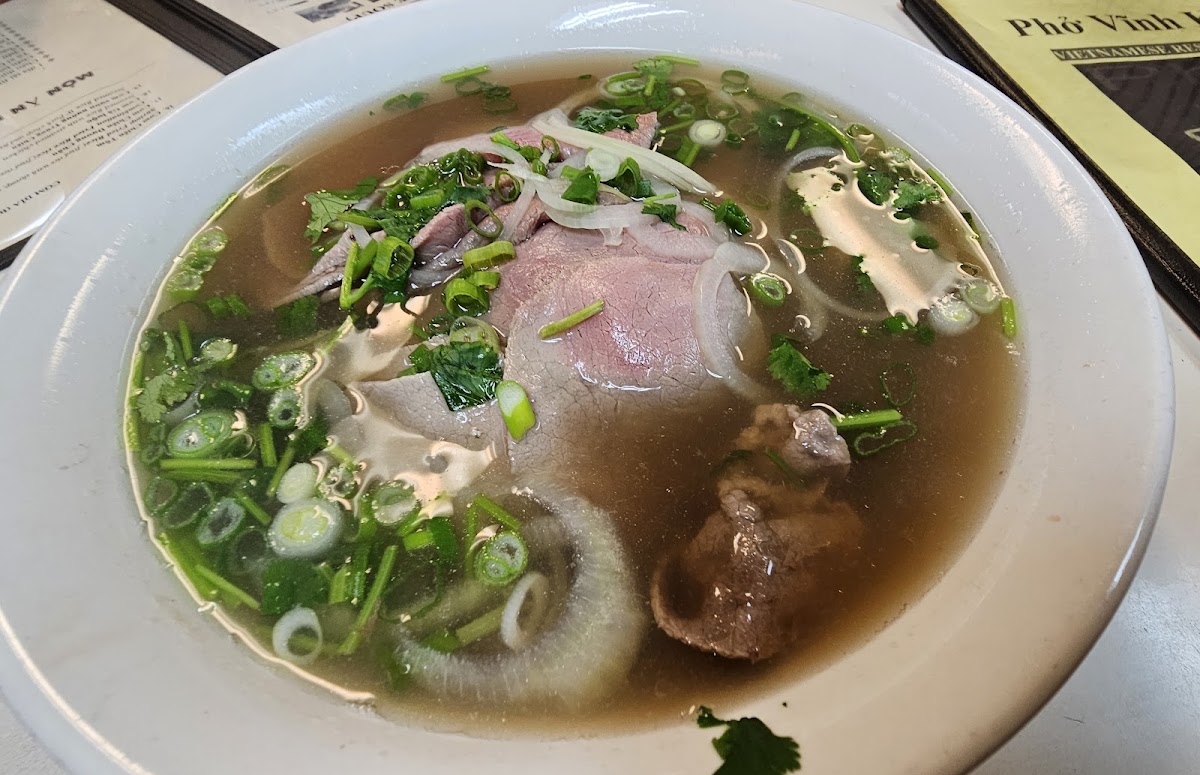 Pho Vinh Ky has 4 other branches in Little Saigon, nice, clean, quiet, all have pho sale, regular $8, big bowl $10. Sale has been going on for years. They do a lot of take outs, same prices. This pho is good. The broth is tasty, not sugary sweet, with bone depth, clean, clear. I ordered a large steaming hot bowl with extra rendered fat and scallion to crank up the creamy taste. Service was quick and pleasant. This big pho bowl has the thin noodle like hu tiu. I prefer the Northern pho with thicker noodles with springy texture. It has lots of meats, rare round eye, flank, chuck, fatty brisket, tripe, tendon. You can specify any cuts you want. The brisket is chewy. I prefer more tender. I am a big eater but could only finish half, packed the rest to go. I also ordered 2 big bowls with rare eye round to go so I can eat them at home and not having to drive down. This pho quality and value is much better than average, where other shops charge $15 or more for the same bowl. A few other pho places also have $8-10 pho. Open 8 Am to 3 AM. This is a honest business that offers tasty, healthy food with very good value, recommended.